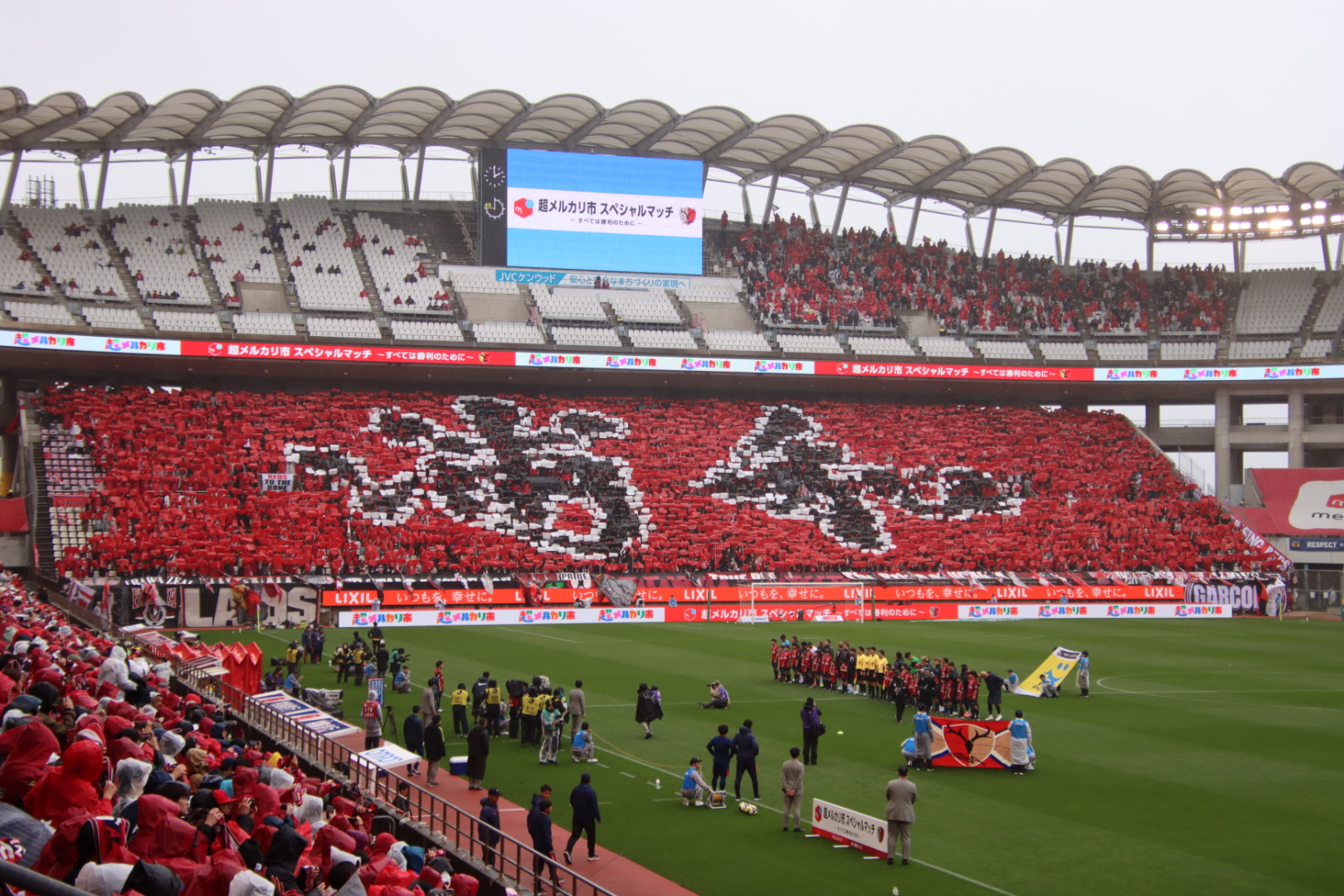 鹿島の本拠地「カシマサッカースタジアム」で行われた一戦は、1-1のドロー決着に。Jでタイトルを争ってきた両雄が激突した一戦には、アウェーながらも浦和サポーターが大挙集結。すると試合前、ゴール裏スタンドには圧巻の光景が。赤く染められたところに「浦和」の2文字が出現する、熱きサポーターならではの演出だった。